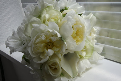 ausia - powodzenia!!! :) sdf - gratulacje :) niech dzidzia zdrowo się rozwija i przychodzi na świat :) he he - jak dla mnie, bez białych butków jednak się nie obejdzie :( bo niestety ecru bucik wysuwający się spod białej sukienki będzie wyglądal jak zżółkły ze starości :( Ewentualnie buciki mogą mieć srebrnawy połyskl, jeśli zdecydowałabyś się na srebrną biżuterię. Sukienka wydaje się w miarę skromna, nie dodawalabym do niej ostrego koloru, poprzestałabym na "pociągnięciu" bieli ze srebrem, czyli w uszy nieduże perełki (i ewentualnie na rękę), dekolt zostawiłabym bez dyndadełek ze względu na marszczenia na staniku sukni). Welon długi do rąbka sukni, może być obszyty koronką, ale jednowarstwowy - broń Boże krotki do pasa/bioder/kolan, bo radykalnie i brzydko skróci sylwetkę!!! i broń Boże podpinac go pod kokiem "na ścierę", bo szyja znika wówczas totalnie :( Bukiet nieduży, puszysty (koronka!), biel + zieleń (ewentualnie ze srebrnym akcentem typu wstążka, drucik), dla męża antracytowy garnitur, biała koszula na spinki i srebrno-antracytowy krawat. Bukiety: http://media.bodaclick.com/img/img_reportajes/6225_1288962651_4cd4025b5be40.jpg (tylko bez tej paskudnej, plastikowej "tutki", po prostu związany srebrnawą wstążką) http://www.fabiogritti.pl/images/styl5/30.jpg http://www.we-dwoje.pl/files/Image/art_bonus_oryg/we_dwoje_1_11797.jpg http://www.strefaweselna.pl/uploads/96.jpg (prześliczny i wdzęczny :) ) http://slubnybukiet.files.wordpress.com/2010/08/bukiet-bialo-zielony.jpg (tu juz chyba ciut za dużo zieleni...) Świetną opcją byłyby po prostu białe peonie, ale to niestety bbb sezonowe kwiaty - są dostępne wyłącznie w czerwcu... http://media.theknot.com/ImageStage/Objects/0003/0012258/large_image.jpg http://3.bp.blogspot.com/_UnHZfyOYACc/SeDiRYUTs_I/AAAAAAAAGyI/lElBIFMjrZw/s400/Bridal+bouquet++white+peonies,+sweet+peas+and+calla+lilies.JPG